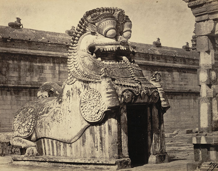 Typically invoked to protect homes, temples or individuals, guardian spirits are a standard presence in Hindu, Buddhist and Jain iconography. These entities are most prominently represented when shown flanking doorways on buildings or in illustrated manuscripts and are depicted more subtly for individual protection in talismanic pendants and garments. Guardian spirits may sometimes be deities in their own right, such as the god Kubera who often assumes the role of a dvarapala, or doorway guardian, in Buddhist temples. While guardians such as Yakshas and Yakshis are depicted in a stately human form, others have animal or chimeric forms, such as Makaras or the many types of Yali. Fearsome entities such as these — also known as grotesques — are meant to represent the powerful natural forces controlled by the temple deity.