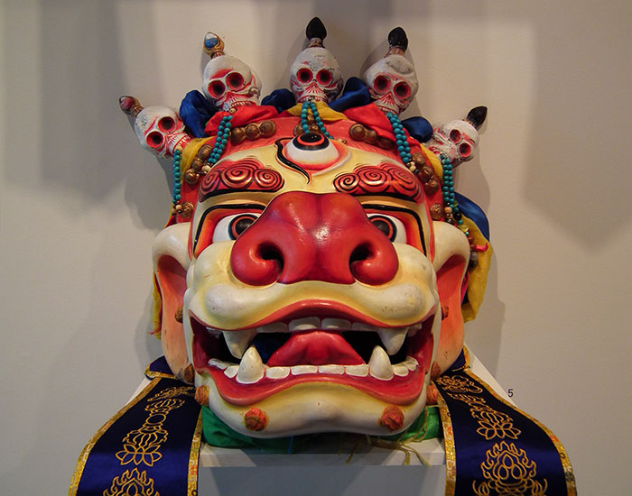 Worn by practitioners of the cham dance in Bhutan, Nepal and India, cham masks are symbolic and ritualistic objects in Vajrayana Buddhism. These masks are believed to embody wrathful, protective deities and inspire fear and terror in the…