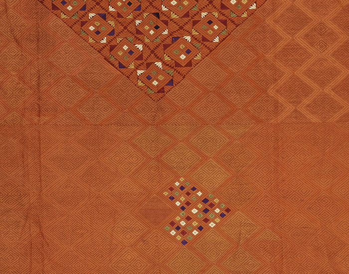 A reversible phulkari that features prominently in wedding rituals, a chope is a large red chaddar (or wrap) embroidered with yellow and gold thread. The chope’s design is composed of geometric forms, mainly triangles and lattice formations, with…