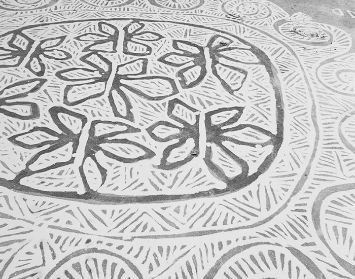In some cases, materials with real-world value are used to ornament an object, such as gold and silver zari thread applied to Banarasi brocades and gota work in Rajasthan, or expensive pigments like ultramarine blue (derived from lapis lazuli) and gold used in illustrated manuscripts. Valuable materials may also be simulated, as in the case of beetle-wing embroidery, or embellishments like coins and cowrie shells used in Banjara embroidery. Temporary murals, such as Mandana, Sohrai and Khovar painting, are often used to mark important events by decorating a home or other important spaces. Ornamentation can also serve a talismanic function, as in the case of Kolam floor painting from Tamil Nadu, even when this is done by ritually marring existing decorative elements with motifs like the Nazar Battu in phulkari embroide